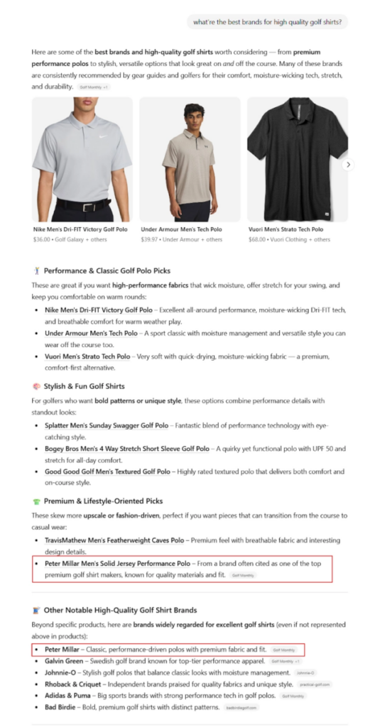 When a user asks, “What’s the best golf polo for hot weather?” the model looks for structured product groupings tied to that use case. It pulls from brands whose categories, metadata, and schema reinforce exactly what they sell.