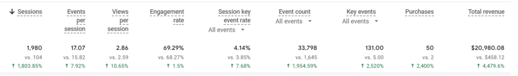 Engagement metrics followed the same pattern. Session key event rate improved, event count scaled significantly, and total revenue per session increased.