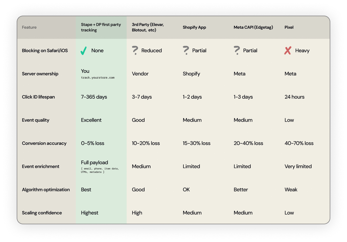 Older setups still relied heavily on browser pixels and short click ID storage. Our implementation: